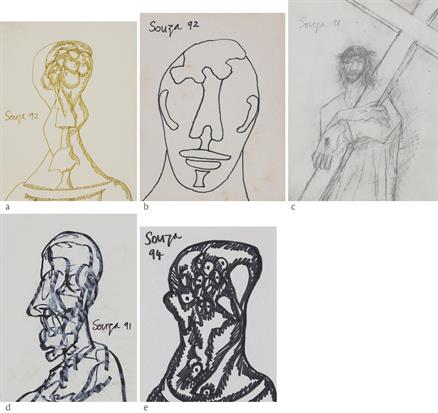 a) Untitled (Head of a Man) Signed and dated 'Souza 92' (centre left) 1992 Felt tip pen on paper 10.5 x 8 in (26.6 x 20.5 cm) b) Untitled (Atlas Head) Signed and dated 'Souza 92' (upper left) 1992 Felt tip pen on paper 11 x 8.5 in (27.7 x 21.3 cm) c) Untitled (Christ Carrying Cross) Signed and dated 'Souza 98' (upper left) 1998 Pencil on paper 11.75 x 8.75 in (29.6 x 22.1 cm)