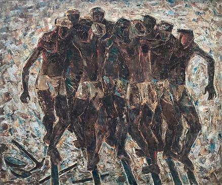 “I have tried to bring out the active life-spirit hidden within rustic village folk; the poor and ordinary people of my surroundings.” - K K HEBBAR Modernist K K Hebbar’s practice was deeply rooted in the folk-art traditions of his home state of Karnataka. People, especially the working classes, were central to Hebbar’s practice, and appear either as the protagonists of the works or populating the larger landscape, gracefully engrossed in lighter revelries, or engaged with their daily labour, as seen in the present lot. “The human figure, and human joy and sorrow, occupied an important place in my compositions. Because of my love for humanity in general and the working-class in particular, I have often chosen subjects depicting the life of the down-trodden and the under-privileged...” (Artist quoted in K K Hebbar, Voyage in Images , Bombay: Jehangir Art Gallery, 1991, unpaginated) Rather than adhering to a particular artistic school, Hebbar developed his own visual language, drawing from elements of classical and folk traditions, Jain miniatures and Ajanta murals, and the rhythmic qualities of music and dance. He employed diverse forms, techniques, and mediums over the course of his career. His agility with the line was adeptly matched by the grace of the figures those lines animated. “Explorative and experimental in his approach, Hebbar’s art displayed a number of styles, from the figurative to the near abstract, and the dichotomy between the two did not generate any discord in his working for he believed that each painting developed in accordance to its own logic.” (Amrita Gupta Singh, Manifestations III: 100 Artists from the Delhi Art Gallery Collection , New Delhi: DAG, 2005) His work showed deep sympathy for those suffering from displacement, conflict, or poverty. His paintings show lighter scenes of happiness and play coexisting with the darker themes of war and unrest. Hebbar’s awe of the figurative form is balanced by his distinct awareness of destruction and pity. This is noticeable in the present lot where the harsh lines are elevated by a sombre palette of earthy browns and greys. The work seemingly shows the artist having used a layer of titanium white below the oils, which he then scraped away to create a textured surface. The present lot was painted during an important year for Hebbar – one that took his artistic repute to new heights. It was in 1961 that Hebbar received the Padma Shri award from the President of India, which was followed by his selection to be a part of the ten-member contingent representing India at the VI Bienal de Arte de São Paulo . The other reputed modernists Jyotish Bhattacharjee, Biren De, Shiavax Chavda, K S Bhattacharjee, K S Kulkarni, Har Krishan Lall, K G Subramanyan, K C S Paniker, Dhanraj Bhagat, and Sankho Chaudhuri. These artists were selected to represent the “vital character of contemporary Indian art” since their works “reflect[ed] a crossroads of current trends in our art” and were “examples of essay in purely abstract form, as well as of virile expressionism.” (VI Bienal de Arte de São Paulo , São Paulo: Museum of Modern Art, 1961, p. 240) Of the 40 paintings displayed at the biennale, five of them belonged to Hebbar. The present lot was one of them.