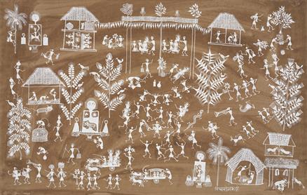 In a country where art is typically approached with a pre-set notion of being obscure and remote, India’s indigenous arts and crafts remain veiled in mystery. Characterised by stylised figures, flat renderings, repetitive motifs, and themes immersed in ritual, religion, and festivity, they encapsulate and celebrate the traditions and way of living of India’s numerous communities. The most well-known of these arts include Warli, Gond, Saura, Madhubani or Mithila, Bengal scrolls, and Kalighat pats . They would be usually undertaken by one community, so they assumed a location or tribe-based identity. Traditionally, communities worked within limitations, using only what was available at the time. One can tell how laborious and time-consuming they are from their intricate details. Until the 20th century, they were restricted to very specific occasions, usually religious and celebratory, and were infused with a unique significance. Jivya Soma Mashe is one of the most widely recognised names in the centuries-old tradition of Warli painting, which is primarily practised by the natives of the Northern Sahyadri mountains. He was the first to step beyond the borders of practising Warli as an art form restricted to rituals. Mashe not only painted on a regular basis, but also switched to using paper and canvas as opposed to following the tradition of practising the artform on mud walls. As a result, the ephemeral nature of wall art was transformed into a more permanent and personal style. Mashe’s art was inspired by folklore and stories of celebration that are narrated to the children in his tribe from a very early age. His images were based on simple forms that keep with Warli figuration, such as the circle borrowed from the moon and sun, the triangle borrowed from mountains and trees, and the square, which has no natural equivalent and is therefore used to symbolise sacred enclosures. Human bodies are represented with two triangles, which are given an extraordinary quality of life and movement. The composition of a scene in Warli art is based on providing a clear coherence and order while expressing the belief that life is in constant and cyclical motion. There is no linear timeline for events. The trees, crops, abodes, and humans who inhabit and animate the world are in harmony with the cosmos, which provides a divine order. Herve Perdriolle, a French gallerist and curator who spent some time with the artist says, “When we look carefully at Jivya Soma Mashe’s paintings, we are particularly struck by the movement, the quality of the details, lightness, and simultaneously the precision of the stroke. There is no hesitation in his works. As seen in every detail, he goes directly to the essence in both the design and composition with the natural simplicity of the ingenue. The teeming profusion of strokes, lines, and dots on the canvas vibrate with energy, constructing skilled compositions that themselves reinforce the dynamism of the whole... The themes that recur in his production — such as the daily activities of his family and the legends of the Warli — are also pretexts for a constant eulogy to movement.” (Herve Perdriolle, Indian Art: Contemporary, One World, Several Worlds , Milan: 5 Continents Editions, 2012, p. 123) Mashe has received much international acclaim both in India, and internationally. In 1974, he met Bhaskar Kulkarni, an artist who brought his art to the attention of galleries in Mumbai. Mashe’s first solo exhibition was held at Jehangir Art Gallery, Mumbai in 1975. He represented India at the show Magicians of the Earth at the Centre Pompidou in Paris in 1989, along with Gond artist Jangarh Singh Shyam. Both artists’ works were featured in the exhibition Other Masters of India , curated by Jyotinder Jain, at the Musee du Quai Branly in Paris in 2010.
