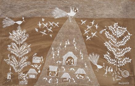 In a country where art is typically approached with a pre-set notion of being obscure and remote, India’s indigenous arts and crafts remain veiled in mystery. Characterised by stylised figures, flat renderings, repetitive motifs, and themes immersed in ritual, religion, and festivity, they encapsulate and celebrate the traditions and way of living of India’s numerous communities. The most well-known of these arts include Warli, Gond, Saura, Madhubani or Mithila, Bengal scrolls, and Kalighat pats . They would be usually undertaken by one community, so they assumed a location or tribe-based identity. Traditionally, communities worked within limitations, using only what was available at the time. One can tell how laborious and time-consuming they are from their intricate details. Until the 20th century, they were restricted to very specific occasions, usually religious and celebratory, and were infused with a unique significance. Jivya Soma Mashe is one of the most widely recognised names in the centuries-old tradition of Warli painting, which is primarily practised by the natives of the Northern Sahyadri mountains. He was the first to step beyond the borders of practising Warli as an art form restricted to rituals. Mashe not only painted on a regular basis, but also switched to using paper and canvas as opposed to following the tradition of practising the artform on mud walls. As a result, the ephemeral nature of wall art was transformed into a more permanent and personal style. Mashe’s art was inspired by folklore and stories of celebration that are narrated to the children in his tribe from a very early age. His images were based on simple forms that keep with Warli figuration, such as the circle borrowed from the moon and sun, the triangle borrowed from mountains and trees, and the square, which has no natural equivalent and is therefore used to symbolise sacred enclosures. Human bodies are represented with two triangles, which are given an extraordinary quality of life and movement. The composition of a scene in Warli art is based on providing a clear coherence and order while expressing the belief that life is in constant and cyclical motion. There is no linear timeline for events. The trees, crops, abodes, and humans who inhabit and animate the world are in harmony with the cosmos, which provides a divine order. Herve Perdriolle, a French gallerist and curator who spent some time with the artist says, “When we look carefully at Jivya Soma Mashe’s paintings, we are particularly struck by the movement, the quality of the details, lightness, and simultaneously the precision of the stroke. There is no hesitation in his works. As seen in every detail, he goes directly to the essence in both the design and composition with the natural simplicity of the ingenue. The teeming profusion of strokes, lines, and dots on the canvas vibrate with energy, constructing skilled compositions that themselves reinforce the dynamism of the whole... The themes that recur in his production — such as the daily activities of his family and the legends of the Warli — are also pretexts for a constant eulogy to movement.” (Herve Perdriolle, Indian Art: Contemporary, One World, Several Worlds , Milan: 5 Continents Editions, 2012, p. 123) Mashe has received much international acclaim both in India, and internationally. In 1974, he met Bhaskar Kulkarni, an artist who brought his art to the attention of galleries in Mumbai. Mashe’s first solo exhibition was held at Jehangir Art Gallery, Mumbai in 1975. He represented India at the show Magicians of the Earth at the Centre Pompidou in Paris in 1989, along with Gond artist Jangarh Singh Shyam. Both artists’ works were featured in the exhibition Other Masters of India , curated by Jyotinder Jain, at the Musee du Quai Branly in Paris in 2010.