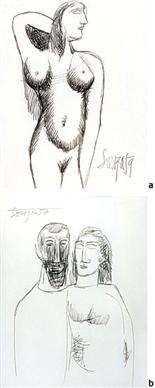 Francis Newton Souza's unrestrained and graphic style created thought-provoking and powerful images. His repertoire of subjects covered still life, landscape, nudes and icons of Christianity, rendered boldly in a frenzied distortion of form. Souza's paintings expressed defiance and impatience with convention and with the banality of everyday life. Souza's works have reflected the influence of various schools of art: the folk art of his native Goa, the full-blooded paintings of the Renaissance, the religious fervour of the Catholic Church, the landscapes of 18th and 19th century Europe, and the path-breaking paintings of the moderns. A recurrent theme in his works was the conflict in a man-woman relationship, with an emphasis on sexual tension and friction. In his drawings, he used line with economy, while still managing to capture fine detail in his forms. He also used a profusion of crosshatched strokes that made up the overall structure of his subject.