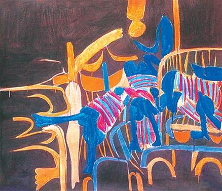 From the 1980s onwards, Subramanyan’s expanded artistic vocabulary grew to incorporate elements from a popular bazaar tradition of glass painting. According to R Siva Kumar, “Subramanyan’s late works were provoking and celebratory, teasing and subversive, humane and irreverent at once. Done with scintillating spontaneity, they were not merely expressive and complex like most things he had done in the past but were also some of his most vibrant paintings. This came partly from his deep engagement with the world and partly from the way he moved from one level of communication, or expression, to another through calculated inflections of his visual idiom. ”