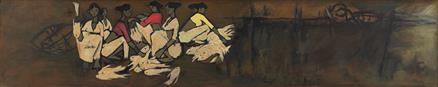 During the early years of her career, B Prabha experimented with a variety of genres and mediums before settling into a style and subject that remained her trademark throughout her career: a strikingly graceful portrayal of rural Indian women, slightly elongated in form, engaging in everyday tasks, as seen in the present lot, as well as lot 17 and 33. “Featured singly or in groups of two or three, [these women] were seen either against flat, undistinguished backgrounds or in their surroundings, the artist chronicling the lives of women from different rural and tribal communities with attentive details of their skin colour, traditional attire and jewellery but keener still to projecting an individual’s inner being or the dynamics between women. The seeming simplicity of the compositions belied the concern for women’s welfare and the need to document their unsung lives that drove the artist, herself practicing at a time when women had few opportunities.” (Kishore Singh ed., “B. Prabha: In A Wasted Landscape,” Masterpieces of Indian Modern Art II , New Delhi: DAG, 2017, p. 361) Painted with a carefully modulated palette, Prabha’s work such as the present lot which depicts a group of fisherwomen in close interaction with one another, speaks volumes about the interiority of women’s lives. Beyond simple documentation, these works are odes to the spirit and struggles of women. Art writer Kishore Singh observes, “All of B. Prabha’s works are marked by a formal elegance of both compositional arrangement as well as palette and brushwork, achieving its height in her work featuring these women but, the same aesthetic and painterly approach is visible in her other works too” (Singh ed., p. 361).Fisherwomen was acquired by the present owner’s father, A M Kadhiresan, who was the chairman of the Indian Overseas Bank in Chennai in 1964, and has been at their residence since.