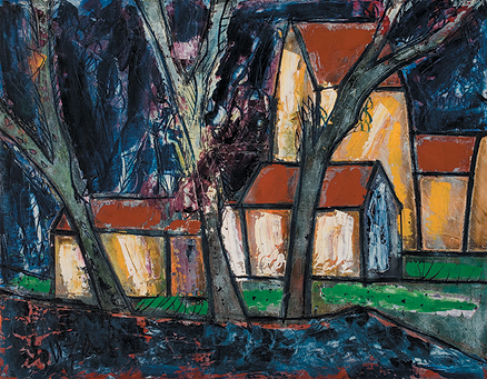 In the present lot, however, the fury and instability of Souza’s landscapes that Mullins describes is replaced with a terrifying calm; a strong force that heaves an eerie stillness down upon the composition. The artist’s palette, typically vibrant, here is muted with shades of midnight blue dominating the frame. Four dull yellow houses with brown sloping roofs stand aloof in the distance, windowless and obstructed from direct view by three meager trees devoid of leaves or life. While the trees serve to offset the geometry of the scene, they also add to its unnatural atmosphere and sense of isolation.