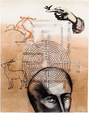 Meditating on the twin concepts of freedom and captivity, ease and struggle, the artist offers the viewer an assortment of printed and painted images in the present lot. Alluding perhaps to her own predicament and the way in which she feels entrapped by her artistic process, these images of mazes, leaping stags and a tiny bird on the verge of flight all seem to spill from a large head, modeled on the artist’s image, at the lower edge of the surface.