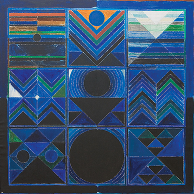 In the present lot, Raza uses a dark palette dominated by blue and black to highlight the twin energies of male and female, as a result of whose fusion germination and genesis occur. Apart from the classical tantric symbology of upright and inverted triangles, the artist also alludes to the duality of male and female using variations of the bindu. At the very center, for example, the artist paints a dense black bindu, throbbing with the life potential it contains, above an inverted triangle, to represent garbha or the womb, the site of germination.