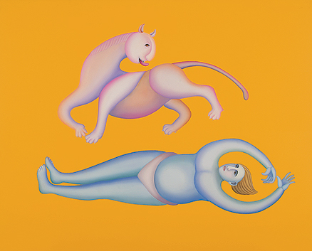 Though his work is almost always figurative and rooted in very real experiences and beliefs, Manjit Bawa’s men, women, gods and animals, suspended wondrously in colourful space, are rendered with a simple fluidity that borders on the abstract. Rather than brushstroke and texture, Bawa relies on chiaroscuro and subtle shading to deliver depth to his canvases; and rather than developing a narrative, the artist focuses on perfecting form by paring it down to its most basic essence. Though this may seem a naïve aesthetic, these characteristics come together to give his paintings an arresting luminosity, and his characters a dreamlike presence.