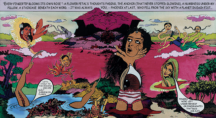 Through her digital collage, drawing, mural painting, photography and installation work, Ganesh explores different cultures, both Eastern and Western. Using her diverse visual vocabulary, she ceaselessly strives to eliminate all those boundaries that exist in reality between race, sex and sexual orientation. Her bold and surreal images explore varying representations of female sexuality and power. Ganesh’s unique approach to storytelling and repeated references to Hindu mythology may be traced back to her Indian roots. In her comic book like sequences of digital prints, Ganesh includes snippets of text, successfully marrying the traditional with the post-modern in a truly unique aesthetic.