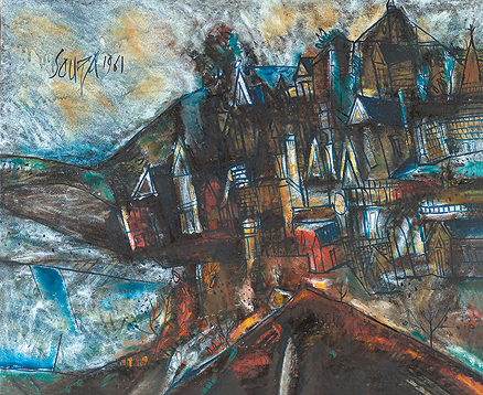 However, Souza’s fortunes were to change dramatically in 1955, and by 1961, the artist was ebullient. He had won both critical and commercial success through his shows and publications, and things were finally looking up. This feeling is reflected in an important series of townscapes executed between 1961 and 63, in which the present lot is included. These pieces, generally painted on canvas rather than board, had a flatter application of colour – a shift away from Souza’s previous, almost architectural constructions of heavy impasto. Another unique characteristic of these works was the diminished fury of Souza’s line; though passionate, it reflected a precision that, till now, had only graced the artist’s drawings.