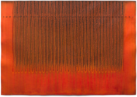 Although he began his career in the 1950s painting in oil on canvas, he worked on paper almost exclusively from the 1980s. In his process, he covered the surface of the paper with structural effects by soaking it in liquid and carving it in several stages while applying inks and dyes. The striated two-dimensional paper was ultimately transformed into a three-dimensional medium. The repetition of careful incisions on the paper was an integral part of his meditation.