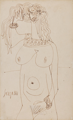 Francis Newton Souza's unrestrained and graphic style created thought-provoking and powerful images. His repertoire of subjects covered still life, landscape, nudes and icons of Christianity, rendered boldly in a frenzied distortion of form. Souza's paintings expressed defiance and impatience with convention and with the banality of everyday life. Souza's works have reflected the influence of various schools of art: the folk art of his native Goa, the full-blooded paintings of the Renaissance, the religious fervour of the Catholic Church, the landscapes of 18th and 19th century Europe, and the path-breaking paintings of the moderns. A recurrent theme in his works was the conflict in a man-woman relationship, with an emphasis on sexual tension and friction. In his drawings, he used line with economy, while still managing to capture fine detail in his forms. He also used a profusion of crosshatched strokes that made up the overall structure of his subject.