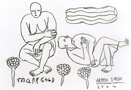"Arpita Singh has pushed the visual lexicon of the middle-aged woman further than almost any other woman artist. The anomaly between the aging body and the residue of desire, between the ordinary and the divine and the threat of the violent fluxes of the impinging external world gives her work its piquancy and edge. At the same time she critiques the miasma of urban Indian life with suggestive symbols of violence that impinge on the sphere...