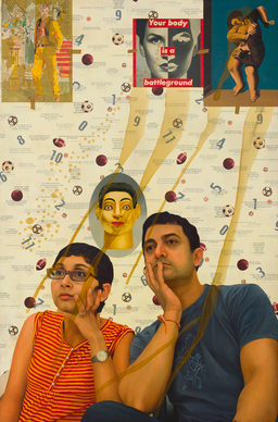 Atul Dodiya’s oeuvre is full of references to cinema, from Bollywood films like Baazigar and Sholay to the works of auteur Satyajit Ray, stars like Amitabh Bachchan and iconic Hindi cinema villains. This present work, named The Titanic Days after the 1928 René Magritte painting it features, is characteristic of Dodiya’s quotational practice which puts pictorial elements from diverse, sometimes surprising, sources in dialogue with each other. Here, Dodiya assembles an image of Bollywood actor Aamir Khan and director Kiran Rao with representations of works of art by René Magritte, Barbara Kruger and Ravinder Reddy. The artist attests, “I was floored by Satyajit Ray, the European New Wave and Japanese cinema. Popular Bollywood imagery provides the element of humour which I bring in my work. As soon as you see Sridevi or Pran in my painting, you smile. I believe in hybrid experiences and particularly like when people are baffled. They spend more time with the work, like wondering-why are Hrithik Roshan, Gandhi, Mohammed Rafi, Johnny Walker, Ambedkar, Lord Krishna and Saint Francis all together in one frame? I am a great admirer of miniature paintings, and also early Renaissance paintings of the 15th century. I refuse to have a singular approach and crave for attempting new things, which definitely means taking risks.” (Sukant Deepak, “Inside Artist Atul Dodiya’s Mind”, IANSlife.in, 30 September 2020, online)
