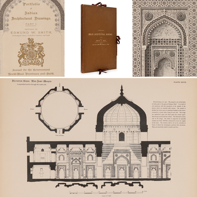 Edmund W Smith, Portfolio of Indian Architectural Drawings: Part I, Issued by the Government North-West Provinces and Oudh , London: W H Allen & Co.; Kegan Paul, Trench, Trubner & Co.; Calcutta: Thacker, Spink & Co.; Bombay: Thacker & Co., Ltd. and Allahabad: The Supt. Govt. Press, North-West Provinces and Oudh, 1897 Title page, [2], 52 loose photolithographed plates by W Griggs including 50 black and white plates and 2 colour plates (plate nos. 39 and 40) each measuring 56 x 38.2 cm; loose as issued in publisher's portfolio cloth with ribbon and gilt text on the front board measuring 56 x 38.2 x 2.8 cm The portfolio consists of high-quality architectural drawings, including plans, elevations, sections, and decorative details. Each drawing is executed with precision, reflecting Smith’s expertise and the meticulous standards of the time. The illustrations are complemented by descriptive text, providing context and analysis that enhance the understanding of each structure. Plates 1 to 7: Turkish Sultana’s House Plates 8 to 20: Rajah Birbal's House Plates 21 to 26: Jodh Bai's Palace Plates 27 to 38: The Jama Masjid Plates 39 to 47: Salim Chisti's Tomb Plates 48 to 52: Sikanadra, near Agra The originals from which the accompanying photolithographs have been reproduced were prepared, in the first instance, amongst others, to illustrate the Report of the Archaeological Survey of India entitled “The Moghul Architecture of Fathpur Sikri.” The size of the Archaeological Survey Reports being only 13 by 9.75 inches, the illustrations were necessarily, in some instances, on too small a scale to be of much practical use to architects, engineers, art students, and others. They served the purpose for which they were intended; but to increase their utility and to further spread a knowledge of one of the most interesting periods of Indian Architecture, the Government of the North-West Provinces and Oudh decided to reproduce a selection of the drawings on a sufficiently large scale to make them of more use to the scientific building professions, artisans, &c. Fatehpur Sikri, likened by some to Pompeii, was built by Akbar as a summer capital between the years 1565 and 1605 A.D, or about the time Holland House, Hatfield, &c., were erected. The Mughal school of architecture was then at its zenith, and the palatial edifices erected at Fatehpur Sikri rank amongst the finest specimens of Mughal architecture. As the architecture of the city is fully dealt with, it was deemed better to illustrate a few typical buildings, elucidated by details, rather than a number without them. The Mughals, to a great extent, relied on painted decoration for beautifying their buildings, and a couple of specimens of the style of decoration employed at Fatehpur Sikri are given in colour plates of XXXIX and XL. The original drawings were prepared, under the compiler’s direction and supervision, by native draughtsman, who received preliminary training in the various Indian Schools of Art before entering the Archaeological Department. The plates have been prepared by Messrs. W Griggs and Sons, who had taken great efforts to reproduce the drawings in a careful way and the generally the trouble taken over the work. NON-EXPORTABLE