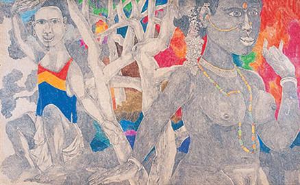 When one looks at Goud’s work, rustic, raw, and potent might be the first words that come to mind. His portraits of men and women represent the dynamic Indian ethos rather than particular individual identities. A recurrent theme with the artist is that of the erotic, treated as an active and powerful aspect of male and female sexuality and existence. Goud’s work is dramatic; his protagonists are raw and vivacious in their appeal, imbibed with energy that reverberates through his strokes and textures. Most of Goud’s art is centered on the rural, recreating landscapes from his childhood as if they were frozen in time. In the artist’s later work, his figures turn softer, more introspective than brash in their outlook.