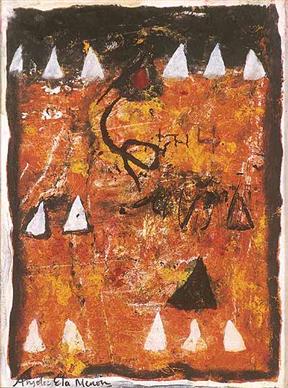 Menon notes, “when repeated often enough, a motif becomes a symbol which in turn becomes a cliché; a cliché becomes an absurdity, a cartoon”. Therefore in 1992, she staged an exhibit of household chairs, trunks and cupboards, all painted with images appropriated from her own paintings. This radical recontextualization of her work constituted a pre-emptive strike by Menon to “remove art from its pedestal”. She continued the re-imagination of her corpus in her “Mutations” series of pentimenti works form 1996, in which Menon manipulated images from her best-known paintings on a computer, and overpainted the print-outs with acrylics and oils.