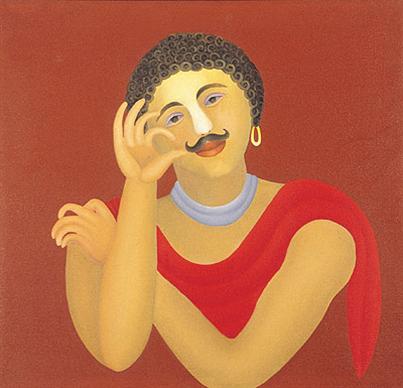 Nature also plays inspiration here. When young, he would travel widely either on foot, by bicycle or simply, by hitchhiking. "I have been almost everywhere - Himachal Pradesh, Rajasthan, Gujarat. I would spread a sheet of paper on the ground and draw the countryside. The colors and the simplicity of people I met fascinated me." Birds and animals make a constant appearance in his paintings, either alone or in human company. Besides nature, the flute is a recurring motif in his works. Bawa learnt to play the flute from maestro Pannalal Ghosh. He has painted Ranjha, the cowherd from the tragic love ballad Heer Ranjha, playing the flute. He has painted Krishna with a flute, surrounded by dogs and not by cows as mythological paintings depict him. Besides these, figures of Kali and Shiva dominate Bawa's canvases; "they are the icons of my country," he feels.