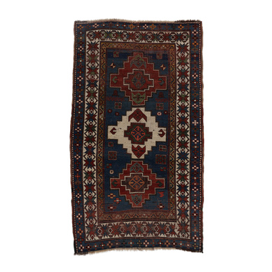 A spaciously drawn carpet from the northern Caucasus mountains. The midnight blue field contains three prominent stepped diamond medallions. The open areas of the field are dotted with abstract sectioned squares and rosettes. An ivory ground major border containing interconnected stars surrounds the central panel. Two outer and inner minor borders flank the major border, one containing geometric flowers and the other containing sectioned interlocking triangles depicting a scrolling vine.