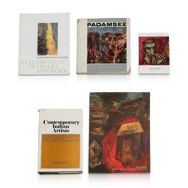 a) Ray Monk and Andrew Robinson, Rabindranath Tagore - A Celebration of his Life and Work , Rabindranath Tagore Festival Committee, 1986 80 pages; paperback in colour printed stiff card covers 10.75 x 8.25 in (27.5 x 21 cm) Published as part of the Rabindranath Tagore Festival celebrations at Museum of Modern Art at Oxford, this volume pays tribute to the life and work of the iconic poet, philosopher, and polymath Rabindranath Tagore. The book brings together an assortment of essays, reflections, and visual reproductions celebrating his literary achievements, artistic contributions, and enduring cultural impact. It was created to commemorate Tagore’s contributions to literature, music, and the arts, marking the centenary of his Nobel Prize in 1913. The publication includes an introduction to Tagore’s philosophical, literary, and artistic vision. A collection of essays and reflections on his poetry, music, painting, and educational philosophy. Illustrations of Tagore’s artworks and photographs from the festival events. A brief overview of Tagore’s influence on modern Indian and global art. A celebration of the Rabindra Sangeet (Tagore’s music) and its continued relevance This volume is an important resource for those studying Tagore’s multidisciplinary genius, encompassing his literary and artistic legacy. b) Shiv S Kapur, Husain , New Delhi: Lalit Kala Akademi, 1961 8-page essay by Shiv S Kapur and 23 illustrations, some in colour, biographical notes; stiff cards with dustjacket 7 x 5 in (18 x 12.5 cm) This early monograph on M F Husain, one of India’s most celebrated modern artists, is authored by art critic and historian Shiv SKapur. The book offers a brief but insightful 8-page essay on Husain’s life, philosophy, and artistic journey, providing valuable context to his figurative works and Indian modernism during the 1950s and 1960s. c) Geeta Kapur, Contemporary Indian Artists , New Delhi: Vikas Publishing House, 1978 pp. xxii, 225 pages with bibliography and index; hardbound with dust jacket 9 x 5.75 in (23 x 14.5 cm) A landmark publication by noted art critic and historian Geeta Kapur, Contemporary Indian Artists is among the earliest substantial critical studies on post-Independence Indian modernism. The book presents in-depth essays on eight seminal artists who shaped the trajectory of modern Indian art in the 20th century namely Francis Newton Souza - 'Devil in the Flesh'. Ram Kumar - 'City-Exile'. Akbar Padamsee - 'The Other Side if Solitude'. Maqbool Fida Husain - 'Folklore and Fiesta'. Bhupen Khakhar - 'View From the Teashop' and Jagdish Swaminathan - 'Wings of a Metaphor'. Each chapter is based on extensive interviews and studio visits, combining biographical insight with critical analysis of form, theme, and sociopolitical context. Kapur's writing here laid the foundation for a distinctly Indian art-critical voice, deeply informed by both Marxist theory and postcolonial discourse. Full-page reproductions of key works. Archival photographs. A critical introduction on Indian modernism. Now out of print and highly sought after, this volume is a foundational text in South Asian art history and remains essential reading for collectors, curators, and researchers. d) Shamlal, Padamsee , Bombay: Sadanga Publications, 1964 44 pages, including a six page essay plus 20 black and white plates, 9 tipped-in colour plates; hardbound with dust jacket 9.5 x 8.75 in (24 x 22 cm) This early and now scarce monograph on Akbar Padamsee, authored by writer and editor Shamlal, was published by Sadanga Publications as part of a pioneering series on Indian modernist painters. It offers a focused study of Padamsee’s evolving artistic vocabulary during the formative decades of his career. The book includes an essay by Shamlal analysing Padamsee’s visual language, philosophical concerns, and formal strategies. A selection of black-and-white reproductions of paintings and drawings. A portrait photograph of the artist. Biographical chronology and exhibition history Published in 1964, it provides a valuable snapshot of Padamsee’s practice just as he was beginning to transition from his early figurative work into the realms of abstraction and metaphysical landscapes. An important early reference work on Akbar Padamsee, produced well before the later retrospectives and institutional monographs. e) H A Gade - Founder Member : Progressive Artists Group , New Delhi: Dhoomimal Gallery, 2014 unpaginated; softbound 11.75 x 8.25 in (30 x 21 cm) (Set of five)