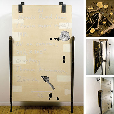 Exhibited at the Venice Biennale in 2005, this series of installations highlights Dodiya’s penchant for creating art that requires active participation from the viewer in its interpretation. In this case, the interaction between the artist, art work and viewer actually takes on a physical dimension in addition to its intellectual one. As the artist notes, “The whole act of seeing or looking at a work of art is so complex. I want…to make the viewer more conscious of the act of looking. When I make canvases stand on crutches, they get a strong physical presence, almost as if you are in front of a human being. To hide a painting behind another painting, which a viewer can’t see properly, is frustrating and in the process the viewer would have to struggle hard, literally, to see the image behind. I am also playing with the absurdity of claiming understanding to any work of art” (Atul Dodiya in an interview with Peter Nagy, iCon: India Contemporary, Bose Pacia exhibition catalogue, Venice, 2005, p. 9).