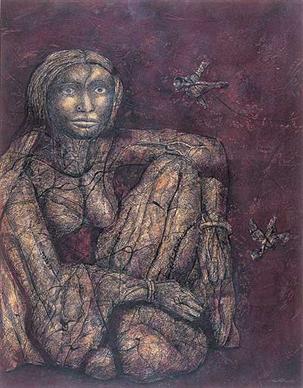 Aditya Basak has a fascination for fantasies that fringe on the real world. He strives to give form to the harsh realities of life and the strange thoughts that lurk in the corners of the subconscious, and both give his paintings a disturbing, haunting quality.