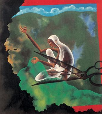 `Time` is part of a series of works using the scissor, a motif that the artist has used for 13 years now. The woman embroidering is `Prakriti`, the tireless force of creation or procreation, which carries with it its opposite - the force of destruction, symbolized by the scissor that eventually cuts the thread of life. The border and skyline are from Pahari miniatures; the jagged edges of the paper symbolize the passing of Time. This work was...