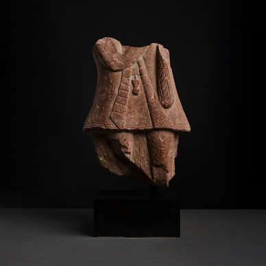 Kushan Dynasty Mathura region, Northern India, Circa 2nd Century Red-mottled sandstone Height: 14.75 in (37.5 cm) Width: 10.5 in (26.5 cm) Depth: 4.25 in (11 cm) The sculpture is attached to a wooden base measuring 4.25 x 8 x 5 in (11 x 20.5 x 13 cm) NON-EXPORTABLE REGISTERED ANTIQUITY PROVENANCE Sotheby’s, London, 24 November 1986, lot 151 Subsequently in the Collection of Late Anthony Gardner, Director, Spink & Son Ltd. Acquired from the above Mathura emerged as one of the principal artistic and religious centres of northern India under the patronage of the Central Asian Kushan rulers during the 1st to 3rd centuries AD. The region’s workshops produced some of the earliest anthropomorphic images for the Buddhist, Jain, and Brahmanical traditions, typically carved in the distinctive mottled red sandstone native to the area. This imposing standing male figure is depicted in Central Asian courtly attire, wearing a long tunic with deeply incised vertical pleats, which reflects the cultural synthesis of the Kushan Empire, where artistic and sartorial traditions from the Indian subcontinent and Central Asia intersected. It is carved on both sides, with a secondary figure on the reverse, indicating that it was originally intended to be viewed in circumambulation. Such double-sided treatment is rare in Mathura sandstone sculptures, and its presence strongly suggests the work may represent a donor or noble patron. Its deep pink colour, characteristic of this region, enhances its visual appeal. The museum-quality work stands at the threshold between presence and absence as a fragment that is surprisingly modern in its abstraction. The loss of the head and limbs shift one’s focus from individual identity to form, allowing the jewellery, drapery, and sculptural mass to attain prominence.