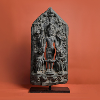 Pala Dynasty Bihar, Eastern India, 12th Century Black stone Height: 28.5 in (72.5 cm) Width: 14 in (35.5 cm) Depth: 5.25 in (13.5 cm) The sculpture is attached to a metal base measuring 2.25 x 14 x 5 in (6 x 35.5 x 13 cm) NON-EXPORTABLE REGISTERED ANTIQUITY PROVENANCE Formerly in a Southeast Asian Private Collection The Pala dynasty (circa 8th-12th century AD) ruled much of eastern India, particularly present- day Bihar and Bengal, and was among the most important patrons of Buddhist and Brahmanical art in the Subcontinent. This stele depicts Vishnu standing in his canonical four- armed form within an architectural prabhavali (arched aureole), adorned with flowing foliage and celestial attendants. In his upper hands he holds his principal attributes, the gada (mace) and chakra (discus), while one of his lower hands carries a shankha (conch) with the other in varada mudra , the gesture of benevolence and compassion. He is embellished with jewellery, including a beaded necklace, a yajnopavita or sacred thread, armlets, anklets, and a finely detailed dhoti secured with a girdle. At the base Laxmi and Saraswati flank him on either side. A kirtimukha or “face of glory” is seen above his crown while two celestial beings descend in flight to garland him. The sculpture’s most striking feature is the refinement of the face. The smile radiates a sense of divinity, and the serene expression is accentuated by gracefully arched eyebrows and elongated eyes with a stylised eastern aesthetic. Its exceptional quality is further evident in the depth of the carving, placement and stance of the attendant figures, and its near immaculate condition with all arms and attributes well preserved barring minor chips and losses commensurate with age. The sculpture possesses a refined and precise presence, resembling a carefully chiselled ivory icon in its delicacy and finish.