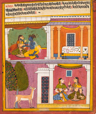 In this charming folio, the narrative unfolds across compartmentalised spaces, a device often seen in early Mewar paintings. Radha and Krishna appear in the upper left, seated outside their chamber. In the adjoining room a bed is prepared with flowers, a garland, and lotus buds. Two sakhis are seen engaged in conversation on the ground floor while a deer approaches them with curiosity. The use of vivid, saturated colours heightens the emotional tenor of the scene. The corresponding verse is inscribed at the top of the page.