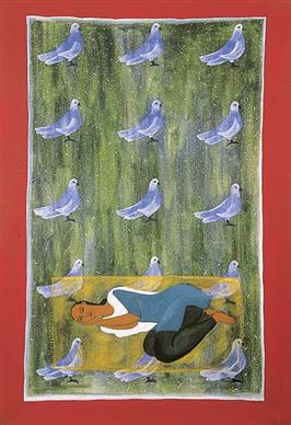 Rodwittiya has always been concerned with the representation of the female figure in her quest to find the vocabulary to represent women without objectifying them, without allowing the viewer to play the role of voyeur. Rodwittiya represents large clothed Gauginesque women as the archetypal figure in their daily work rituals, dwarfing their tools and objects that surround them, in a celebration of the female protagonist.