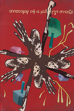 A dedicated documenter of the city of Mumbai and its metropolitan ways of life, Jitish Kallat's canvases reveal the nuances of urban existence in a megalopolis that is allied to both the past and the future through a cipher of images, text and subtle references. In the present lot, Kallat uses a lurid palette dominated by vermillion to portray a street-child, and, in doing so, to wittily bring to the viewer's attention the precarious existence of the city's large population of orphans, homeless children and child labourers. While the artist captures the innocence of a monstrous sneeze in the central mirrored image, he also portrays in the background images of rubber mallets to symbolize the violence and inhumane labour that obliterate the innocence in these children's lives. Closely related to his work from the Covering Letter and Humiliation Tax series of paintings from 2004-05, this canvas also reveals Kallat's fascination with the vivid colours of Pop Art and stark imagery of agitprop posters. In his works from this period, "…Kallat has re-wired his aesthetic in distinctive ways, moving towards a treatment of surface, image and reference that is more informal, that travels lighter, and that is coded with and updated set of references…these new works attest to a conspicuous loosening-up of colour: theirs is a fresh, bright chromatics dominated by pinks, cyans and yellows. These surfaces are also marked by a flatness that is alternately delicious and disturbing: Kallat has adapted the strategies of the billboard, in order to operate between the opposites, as he suggests, of Agit-Prop on the one hand and Pop on the other. It could also be suggested that Op Art and History Painting form another crossing of axes for the present work" (Ranjit Hoskote, "The Pictorial Declarative: Reflections on Jitish Kallat's Recent Works 2002-2005", Jitish Kallat, Walsh Gallery and Gallery Chemould exhibition catalogue, 2004-05, p. 39).