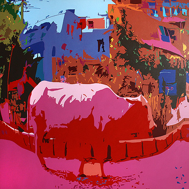 George Martin’s works are a spectral of luscious colour. He paints a magical view of the world around us, which appears to be spinning at a dizzying speed. His acrylic abstractions exuberate copious amounts of energy and are an ultimate representation of modern urban life. There are no limitations to colour or form in Martin’s visual extravaganza; in a single canvas he is able to merge multiple cultures. However, when viewed more carefully, Martin’s densely populated compositions resonate the transitory and disunited true nature of our world.