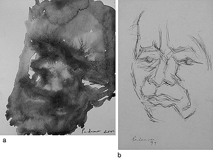 Padamsee’s interest in structure and form takes shape from landscapes, and is borne from an interest in Sanskrit texts such as the Abhijanashakuntalam . His Mirror Images reflect a concern with the duality of existence. His portraits and heads are treated with the same interest in constructing form rather than in the specifics of portraiture. The only occasion when he created identifiable portraits was in 1997, with his “Gandhi” series of works on paper in watercolour and charcoal.