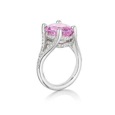 Centering on an oval-shaped purple pink sapphire, weighing approximately 6.57 carats, to the two-tier diamond-set base and the bifurcated diamond-set shoulders, with a total diamond weight of approximately 0.45 carats, mounted in 18 K gold