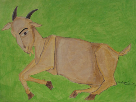 When one looks at Goud’s work, rustic, raw, and potent might be the first words that come to mind. His portraits of men and women represent the dynamic Indian ethos rather than particular individual identities. A recurrent theme with the artist is that of the erotic, treated as an active and powerful aspect of male and female sexuality and existence. Goud’s work is dramatic; his protagonists are raw and vivacious in their appeal, imbibed with energy that reverberates through his strokes and textures. Most of Goud’s art is centered on the rural, recreating landscapes from his childhood as if they were frozen in time. In the artist’s later work, his figures turn softer, more introspective than brash in their outlook.
