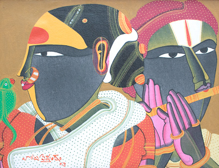 Thota Vaikuntam hails from Andhra Pradesh, in South India, and finds his inspiration in the rural areas of the state. Men and women of his village are often the central characters of his work. Telangana women, in particular, are frequent subjects for his works. The obsession can be traced back to his childhood, when he used to be fascinated by the male artists who used to impersonate female characters in the travelling theatre groups that performed in his village. He admits finding the women of his village very sensuous and that he only attempts to capture their vibrancy.