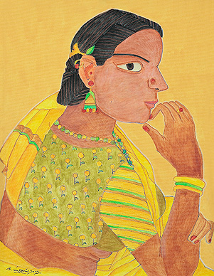 When one looks at Goud’s work, rustic, raw, and potent might be the first words that come to mind. His portraits of men and women represent the dynamic Indian ethos rather than particular individual identities. A recurrent theme with the artist is that of the erotic, treated as an active and powerful aspect of male and female sexuality and existence. Goud’s work is dramatic; his protagonists are raw and vivacious in their appeal, imbibed with energy that reverberates through his strokes and textures. Most of Goud’s art is centered on the rural, recreating landscapes from his childhood as if they were frozen in time. In the artist’s later work, his figures turn softer, more introspective than brash in their outlook.