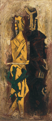 Born in 1913, M.F. Husain, a largely self-taught artist, was a founding member of the Bombay based Progressive Artists' Group. Since the first exhibition in which his works were included in 1947, Husain's oeuvre continually evolved and engaged with various themes and media, and is often used as an indicator of the growth and development of modern Indian art. Developing on the theme of his seminal 1964 painting, Mithuna, this canvas contemporises the classical Indian narrative of Abhisarika Nayika, one of the Ashta-Nayika or eight types of heroines classified in the Natya Shastra, an ancient Sanskrit treatise on the performing arts. These heroines are said to represent the eight different conditions of the nayak-nayika or hero-heroine relationship, and have been used as themes in classical Indian painting, sculpture, dance and poetry for centuries. Abhisarika, the eighth nayika, is the heroine on her way to meet her lover, against all odds. Classical depictions of Abhisarika are generally night time scenes that pit the daring heroine against snakes, witches and thunderstorms. In Husain's version of the narrative, the heroine, with her arms crossed across her chest to protect her modesty, encounters a Minotaur like creature: half-man, half-bull. Standing close by her side, it almost seems as if this shadowy creature with its mask-like countenance is the Nayak or hero Abhisarika set out to meet. Perhaps, in the vein of the eternal 'beauty and the beast' story, the nayika will be able to look beyond appearances and love this unsightly brute. Alternately, perhaps it is the beast that tempts or seduces Abhisarika to his side, recalling the creation myth about Eve and the Garden of Eden. As Shiv S. Kapur notes, "Animal symbolism and masks are inextricably tied up with the religious tradition of every race. They represent an ancient community of basic identity between man and beast, a recognition by man of his own bestial urges...As has been suggested the daemonic element has always been present in Husain's works. In animal symbolism and the use of masks that element is, during this period, given a strongly ritualistic effect, culminating in the Mithuna and Abhisarika of 1965...The sense of ritual and of daemonic seduction is particularly strong in Abhisarika and Mithuna. In Abhisarika the prototype tempter is a shadowy male figure wearing the mask of a monster and all but enveloping the woman" (Husain, Harry Abrams Inc. Publishers, New York, 1972, p. 48, 49). In Abhisarika, Husain's ability to borrow from various histories and artistic traditions is evident. His "...metaphor is rich and of great expressiveness. It brings a wide sweep to his way of looking at things, to his many approaches to reality. His symbols and represented objects are often startling in juxtaposition because they are drawn from such far reaches of artistic memory. Dark, intuitive and sometimes traditional symbols are cast within contemporary design and given meanings that seem valid for this and every other time" (Shiv S. Kapur, Husain, Lalit Kala Akademi, New Delhi, 1961, p. 1).