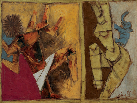 M.F. Husain's unique modern idiom has always acknowledged traditional Indian sensibilities, and, on several occasions, adopted classical Indian aesthetics as a substrate on which his images could be constructed. Particularly inspired by India's sculptural traditions, where music and musicians were popular subjects, Husain frequently attempted to capture the multifaceted nature of artistic expression on his canvas. In paintings like the present...