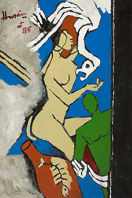 M.F. Husain's "...was a painterly language that embraced the formal possibilities of European Modernism and deployed it imaginatively to capture the tenor and texture of an emergent India immediately after Independence. His innate ability to grasp the many syncretic traditions of the country and lend them visual form made his work a symbolic embodiment of the project of nation- building; he was soon to become the most fêted modern artist during...