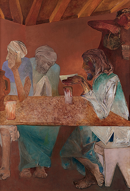 A deeply humanist painter, Khanna frequently focused on the subaltern in his work. From rural migrants sleeping on the bed of a truck and exhausted musicians returning home at the end of the day, to huddled groups of refugees and labourers catching a short break at roadside tea stalls, the artist magnified and celebrated the unnoticed populations of Nizamuddin and Bhogal, where he lived and worked, on his canvases. "Krishen's phase of involvement with the theme of social realism coincided with his activist period. During this period his themes drew from the little eddies and streams that feed the waters of Indian life. Those that seldom attract a second glance, the non-persons of the Indian streets, become Krishen's unlikely heroes" (Gayatri Sinha, Krishen Khanna - A Critical Biography, Vadehra Art Gallery, New Delhi, 2001, p. 112). In the present lot, Khanna offers the viewer a ringside seat and almost voyeuristic presence in one of his most engaging representations of street life in North India. Set at a dhaba or tea stall, a recurring location in Khanna's body of work, this canvas captures a light moment in the otherwise tedious lives of the migrant labourers that inhabit the outskirts of Delhi. As the owner pours hot tea from a kettle in the background, three labourers huddle around a makeshift table in the foreground and exchange the day's news after their meal, escaping for an instant from their misfortunes and from Delhi's biting winter chill. Unsurprisingly, this scene closely resembles the Biblical story of the 'Supper of Emmaus', part of the narrative of Christ's visitations following his death and resurrection. "Khanna's engagement with Biblical allegory and Hindu myth has served as his instrument of engagement during troubled periods in India polity. The fact that Krishen's labouring men are reimaged in the Christ cycle of paintings indicate how he brings the economically disenfranchised and the religious minority on the same plane" (Gayatri Sinha, Krishen Khanna: The Embrace of Love, Mapin Publishing Pvt. Ltd., Ahmedabad, 2005, p. 17). In executing such exchanges, the artist brings attention to the massive marginalized and dispossessed populations of India's large cities, a subject that has always been close to his heart. In such "…very mundane depiction[s], Khanna is in fact merely being faithful to the divine modus operandi of Christianity, where the promise of salvation is realised through that most intimate and earthy of forms, a babe in a manger" (Nina Martyris, "Christ sups at a dhaba", The Times of India, Mumbai, 30 August, 2005).