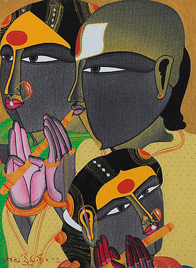 Thota Vaikuntam hails from Andhra Pradesh, in South India, and finds his inspiration in the rural areas of the state. Men and women of his village are often the central characters of his work. Telangana women, in particular, are frequent subjects for his works. The obsession can be traced back to his childhood, when he used to be fascinated by the male artists who used to impersonate female characters in the travelling theatre groups that performed in his village. He admits finding the women of his village very sensuous and that he only attempts to capture their vibrancy.