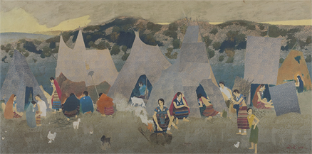 Born in Indore in 1910, Bendre was one of the most distinguished pioneers of modern Indian art. As a painter and teacher, he relentlessly experimented with the adaptation of the technical and stylistic innovations that were taking the European art world by storm to Indian themes and subjects. Through his career, he closely followed the development of Expressionism, Impressionism, Cubism, and Pointillism, interpreting their philosophical underpinnings to fit his bucolic landscapes and tranquil images of rural life in India. Even after Bendre retired from his teaching position in Baroda and moved to Mumbai, his artistic experimentation with colour, style and form did not come to an end. Following a brief period of abstraction, Bendre used his new found time and freedom to study the figure once again. More specifically, the artist turned to painting the rural Indian women he had encountered on his extensive travels around the country, engaged in various household, work-related and leisurely activities. The present lot, a large canvas from 1979 executed in the pointillist style, marks the zenith of one of the most important phases in Bendre's oeuvre, and illustrates his unique response to European Modernism. Here, the artist combines the scientific style of pointillism, pioneered by Georges Seurat in the late nineteenth century, with his subjective, expressive vision of India's people and landscapes to create a vivid scene that reflects his distinctive artistic sensibility and the environs he was so familiar with. Unlike most of Bendre's idyllic vignettes of rural life from the period, however, this canvas focuses on a large group of Lamani or Banjara women rather than a single village figure. Also, instead of a timeless domestic scene, the setting here is a transitory one, illustrating the itinerant lifestyle of the subjects. Seated outside their makeshift tents wearing their characteristic colourful outfits and heavy silver jewelry, some of the nomadic women tend to their children and the few animals around them, while others cook the evening meal for their families, soon to return from the day's labour.