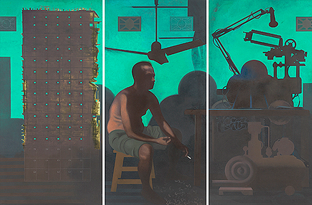 Nataraj Sharma's art often explores the relationship between man and machine in today's industrialized age, where direct contact between the two is unavoidable. Visually dramatic and overwhelming in both scale and subject matter, the artist's works allude to the unpredictable yet inevitable confluences of nature, civilization and industrialization. His factory interiors and urbanscapes seem to underscore the reality of such developments, touted as 'progress', distilling them to their basics, and in doing so, revealing more complex interactions. These works mirror a sensibility and sensitivity that acknowledges the fast changing contemporary world, but also questions the socio-economic and political repercussions of this heady, never ending project. The protagonists that narrate the artist's vision on canvas are man and machine. In the present lot, a bleak interior, the silhouette of a seated man is contrasted against a factory full of inanimate equipment, seemingly in decay. As Peter Nagy suggests, perhaps Sharma "recognizes something anthropomorphic but also emotional in these machines, often abandoned to decay or arranged into what could be mistaken as social groupings. Both still life and landscape, these arrangements of machines prove to be opportune for displaying the painter's skills of composition and rendering, his adroit perceptions of the play of light, and his deft sense of color" (Nataraj Sharma, Bose Pacia exhibition catalogue, 2005, not paginated). Grant Watson asked the artist about the source of his fascination with machines, to which Sharma responded "When I came to Baroda in 1994 to teach at the art school I had become saturated and reached a dead end with the human figure. Baroda was and still is a rapidly expanding city. I rented a house on the outskirts of the city and all around me I could witness construction and upheaval. Through this experience I became interested in the transgressed and transforming landscape on the urban periphery and also the mechanisms that authored this progress. In 1996 I wrote: "On Sama Road a familiar upheaval goes on. Gouged up earth, the earth's innards lie exposed. Looking down I see large drainage pipes, hard and cylindrical, embraced by sinuous electric cables. I take a turn to the right and pass through some desperate shanties before falling upon a magnificent, convoluted vision. A wasteland ravaged and desolate. An open view through to the horizon. Eroded gullies and a deep cleft filled with stagnant water. This whole rough-and-tumble landscape criss-crossed by a network of trembling footpaths… Objects have a still life, a permanence and a consistency that stands in contrast to the fickleness of human exchange. Look at objects and they look back without blinking…They say: "Reveal us and we will reveal you" (Voices of Change: 20 Indian Artists, Marg Publications, Mumbai, 2010, p. 113).