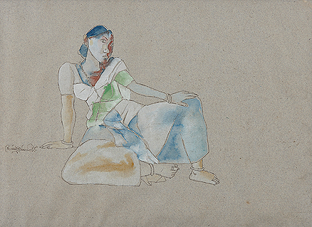 Goud's "Woman" is more resonant of the artist's style-her sexuality and voluptuousness draw the gaze of the male. Yet Goud empowers her through her lackadaisical casualness and ease of appearing provocative. There is a shrewdness and return to primitivism that is suggested by her knowledge of her sexuality and her posture. Jackimowicz suggests a paradoxical manifestation of character: "unassuming as well as knowing" (Solo Show of K. Laxma Goud:...