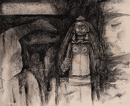 Ganesh Pyne is obsessed with death. He can't forget his first brush with death, in the summer of 1946, when communal riots had rocked Kolkata. His family was forced out of their crumbling mansion. As he roamed around the city, he stumbled upon a pile of dead bodies. On the top was the body of a stark naked old woman, with wounds on her breast. No wonder then his paintings rarely has light backgrounds, and blue and black happens to be his favorite colors. Death also finds its way back into his canvas through different motifs. Working mostly in tempera, his paintings are rich in imagery and symbolism. Pyne was born in Kolkata and grew up in a decaying mansion. He also grew up on stories told by his grandmother --- fold stories, mythological stories, and fairy tales. He spent several evenings in smoky Kolkata cafes discussing communism and Picasso with his friends. "My childhood memories revolve around Kolkata. The sounds and smells of this city fill my being. I love Kolkata." He doesn't remember the first time he started to paint, but does remember the anger that he drew from his family over his decision to become an artist. Pyne, nevertheless, took admission in the Government College of Arts and Crafts, Kolkata. "My first painting was 'Winter's Morning' which showed me and my brother going to school," he recalls. In 1963, he joined the Society for Contemporary Artists. During that period he made small drawings in pen and ink. "I did not have enough money then to buy color," Pyne says. This was also the period of experimentation. The anger and despair of the 70s fuelled one of the most fruitful periods' in his life as an artist that culminated in works like 'Before the Chariot' and 'The Assassin'. However, sometime in the 80s, he shut himself from the world, driven away by the jealousy and pettiness that the art bazaar arose among his friends. Initially, Pyne painted watercolors and sketches of misty mornings and wayside temples, variously influenced as he was by Walt Disney and the art of Abanindranath Tagore. He counts Hals Rembrandt and Paul Klee as the other influences. His signature style shaped from his own experiences of solitude, alienation, pain, horror and moods of tenderness and serenity comes to surface in each of his works. At times, these images are offshoots of an idea that may have flitted through his mind. At others, they resonate lines from poems that may have made an impression on his mind. The lines are bold, precise, controlled and the drawings that emerge are potent both in form and content. Stripped of color, they convey the architectonic quality in the structuring of the images. Equally devoted to cinema as he is to painting, Pyne has also drawn inspirations from movies made by Fellini and Ingmar Bergman. Today, he is known as the foremost exponents of the Bengal School of art. Pyne passed away in 2013.