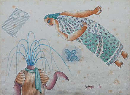 Bizarre images crowd his canvasses and form an integral part of his art: images that float in the air, survey the world with their legs pointing skyward, distorted beyond recognition. He explains, "If some of the figures in my paintings are seen suspended in the air and others, upside down, it is so because I am trying to present the predicament of a middle-class man, who does not have a secure foot-hold in our society, who has to make compromises, face disappointments and whose dreams and aspirations are invariably turned down."