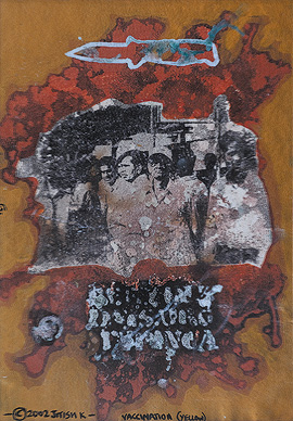 He chooses a method that is a very economical, nearly abstract , form of narrative. Images float around the protagonist, like icons on a computer screen, creating a webwork. The sources are "any visual material relevant to me." Images of the print media are photocopied, transferred on to the surface, hence 'real', as against the painted which he considers fictional. The images are like a picture puzzle, which the viewer has to decode and conclude upon. The treatment of the picture plane is like a battered wall, and refers to the duality in his painting.