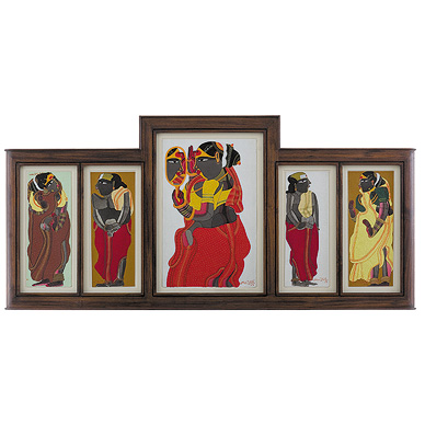 Thota Vaikuntam hails from Andhra Pradesh, in South India, and finds his inspiration in the rural areas of the state. Men and women of his village are often the central characters of his work. Telangana women, in particular, are frequent subjects for his works. The obsession can be traced back to his childhood, when he used to be fascinated by the male artists who used to impersonate female characters in the travelling theatre groups that performed in his village. He admits finding the women of his village very sensuous and that he only attempts to capture their vibrancy.