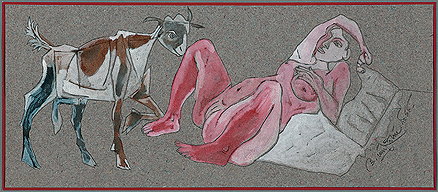 When one looks at Goud’s work, rustic, raw, and potent might be the first words that come to mind. His portraits of men and women represent the dynamic Indian ethos rather than particular individual identities. A recurrent theme with the artist is that of the erotic, treated as an active and powerful aspect of male and female sexuality and existence. Goud’s work is dramatic; his protagonists are raw and vivacious in their appeal, imbibed with energy that reverberates through his strokes and textures. Most of Goud’s art is centered on the rural, recreating landscapes from his childhood as if they were frozen in time. In the artist’s later work, his figures turn softer, more introspective than brash in their outlook.